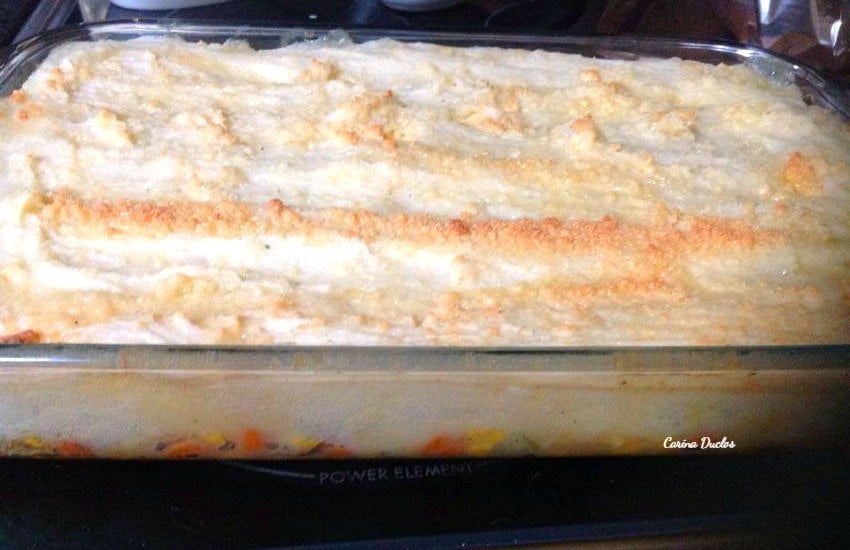 - Cover the vegetables with mashed potatoes, spread evenly then sprinkle with Parmesan cheese.